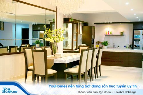 Khu vực nhà bếp khá sang trọng với tấm gương phản chiếu làm cho không gian trở nên rộng hơn