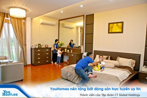 Phòng ngủ không có đồ trang trí. Nội thất làm bằng gỗ nhẹ. Gương soi, sàn gỗ với tấm thảm có hoa văn mềm mại tạo không gian tự nhiên nhưng rất thời trang