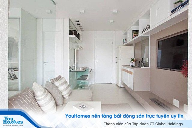 Căn hộ có diện tích chỉ 35m2 nhưng bố trí không gian sống không chỉ đầy đủ tiện nghi mà còn đảm bảo tính thẩm mỹ cao với những tông màu sáng sang trọng.