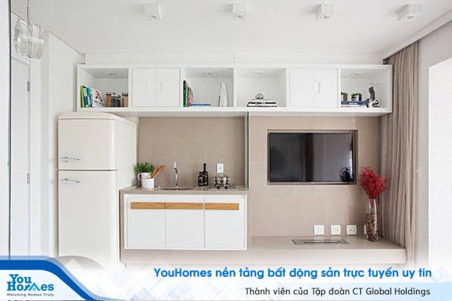 Kính cùng các mảng tường màu sáng giúp phòng chức năng sang trọng. Các mảng tường được tận dụng tối đa để đóng các ngăn cất đồ, bếp ăn. Thiết kế độc đáo, mới lạ khi kết hợp tủ bếp, tivi và hệ thống loa âm tần hài hòa. Bình hoa đỏ tạo nên nét chấm phá cho cả khung hình, là sắc màu đem lại sự ấm cúng.