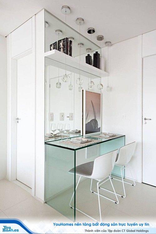 Bàn tiệc được thiết kế sang trọng với diện tích nhỏ nhưng lại lung linh nhờ hệ thống đèn treo hiện đại. Bàn kính và gương phản chiếu khiến không gian thêm phần rộng lớn. Nhờ hệ thống gương lớn đánh lừa thị giác mà các thiết kế ở bếp đều được phản chiếu. Khăn trải bàn, đĩa, ly,... được trang bị đầy đủ cho một bữa tiệc hoành tráng dành riêng cho 2 người.