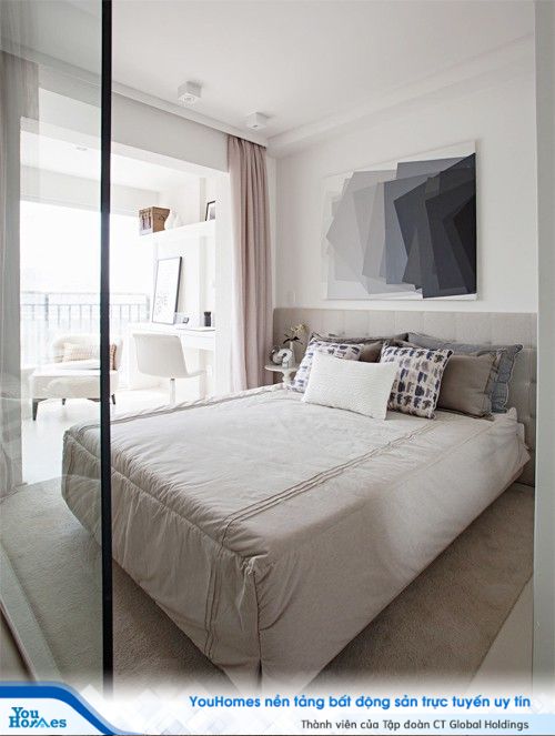 Chỉ cần kéo tấm rèm là tạo được sự riêng tư cho phòng ngủ. Từ tấm thảm đến ga trải giường và nhứng chiếc gối được lựa chọn theo cấp độ màu sắc khác nhau giảm bớt sự nhàm chán và tăng thêm sự sáng tạo. Bức tranh treo tường được tạo nên từ những hình khối với những góc cạnh khác nhau, điều đặc biệt ở đây, là bức tranh này cũng được phối màu theo các cấp độ từ đậm đến nhạt dàn. Phải chăng đây là chủ đích của chủ sở hữu khi chọn lựa một bức tranh đầy tính nghệ thuật như vậy?