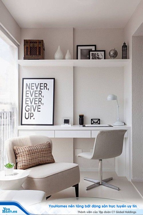 Góc làm việc nhỏ nhắn với chiếc bàn nhỏ xinh xinh. Tường nhà được tận dụng làm nền tạo nên tủ đựng đồ siêu hiện đại. Với những vật dụng nhỏ xinh mang đậm dấu ấn cá nhân của người trưng bày. Các khung tranh đều được chọn theo tông màu đen trắng tạo nên tổng thể thống nhất. Một chậu sen đá nhỏ đem lại sức sống, nguồn cảm hứng sáng tạo khi làm việc.
