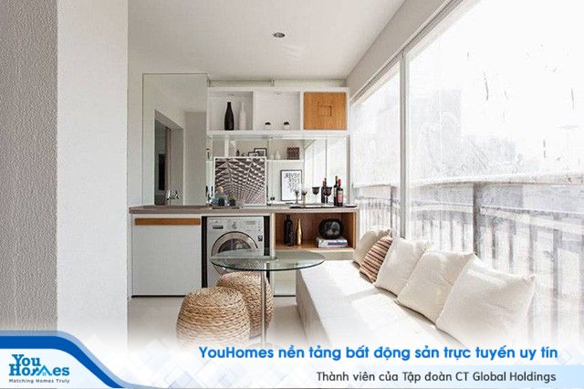 Nhắc đến ban công, người ta thường nhớ đến phần diện tích bên ngoài căn hộ, là không giản để trống dùng để hóng gió, tận hưởng quang cảnh bên ngoài. Tuy nhiên với căn hộ độc đáo này, ban công được tận dụng tối đa với hệ thống tủ độc đáo, kết hợp với bàn rượu vô cùng hoàn hảo. Tựa mình vào chiếc sofa mềm mại và thưởng thức một ly rượu dưới ánh sao lấp lánh trên bầu trời thì còn gì tuyệt vời hơn!