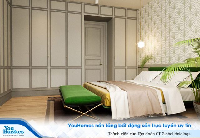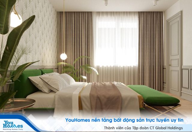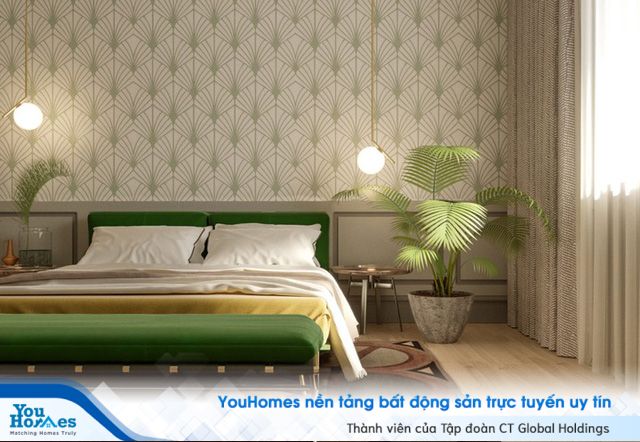 Trong phòng ngủ, gia chủ vẫn không quên trang trí cây cảnh được đặt ngay cạnh giường ngủ. Cùng với đó là vải bọc trải giường có màu xanh lá khá phù hợp với chậu cây cảnh bên cạnh. Bức tường cũng được phủ lên một lớp giấy gián tường có hoạ tiết thiên nhiên góp phần làm cho phòng ngủ trở nên mát mẻ, thoáng mát hơn.