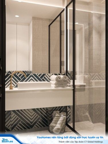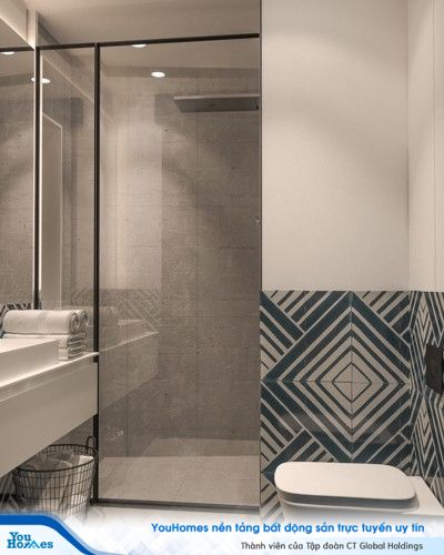 Một khu vực mà chủ nhà cũng rất hài lòng về sự lựa chọn và mắt thẩm mỹ của mình. Đó chính là phòng tắm. Phòng tắm lại có tông màu rất khác với các phòng khác, nó lại mang tông màu chủ đạo chính là trắng và đen. Trên tường được ốp đá hoa có hoạ tiết dọc đen mang lại vẻ độc đáo cho phòng tắm.