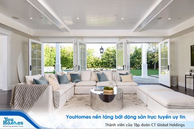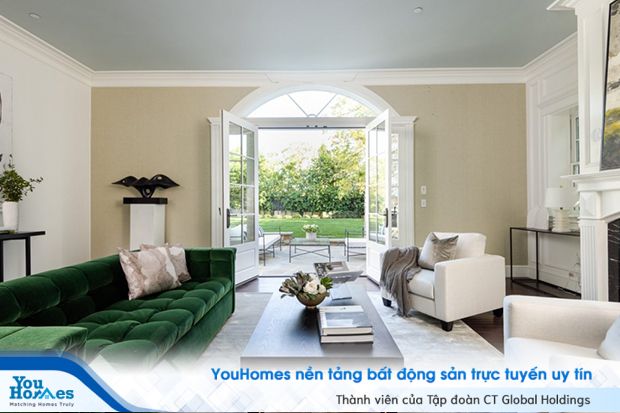 Không gian sống rộng lớn và ấm cúng này tràn ngập ánh sáng tự nhiên và dễ dàng tiếp cận sân sau thông qua ba cánh cửa đôi kiểu Pháp.