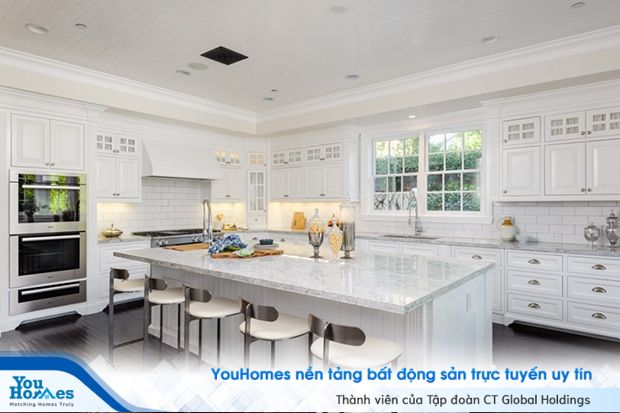 Nhà bếp lấy cảm hứng từ trang trại cực kỳ bóng bẩy này, được trang bị các thiết bị hiện đại và sàn gỗ cứng.