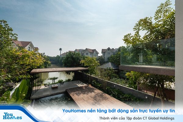 Phần sân vườn tuyệt đẹp với view hồ. Thiết kế phần bàn uống nước ở không gian mênh mông nước giúp người sử dụng có được nơi ngả lưng tuyệt vời mỗi ngày.