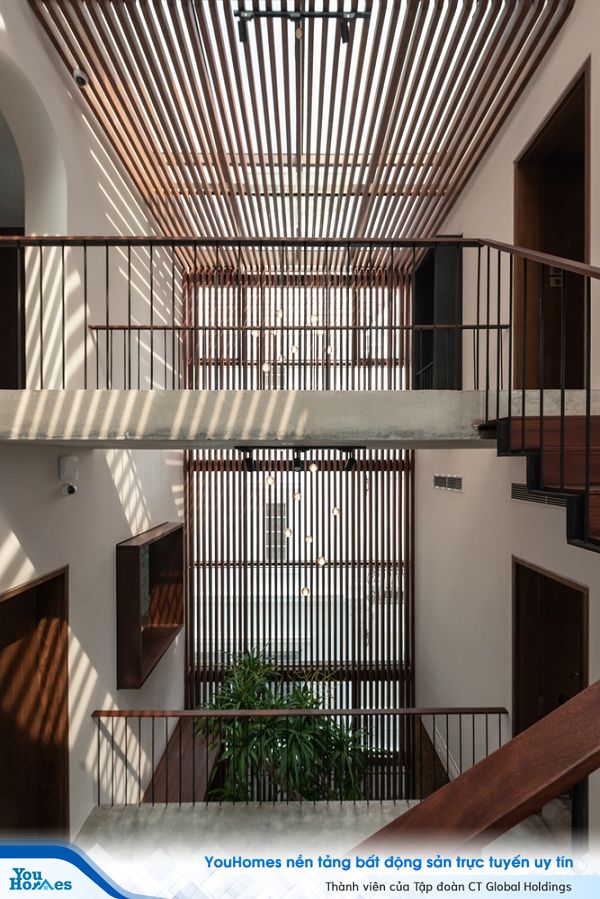 Phần giếng trời với thiết kế với những thanh gỗ đem lại mảng sáng tuyệt vời cho phần hành lang cầu thang tưởng như nhàm chán.