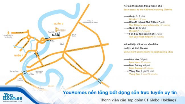 Nằm ngay mảnh đất trung tâm của khu đô thị mới ở miền Đông thành phố, Masteri Thảo Điền không chỉ có view nhìn ra sông Sài Gòn thoáng mát, trong lành mà còn giúp cư dân ở đây tiết kiệm được thời gian di chuyển để đi làm, đi học hoặc đến các điểm vui chơi, giải trí lớn trong khắp thành phố. Từ Masteri Thảo Điền, bạn chỉ mất khoảng 7 phút đến quận 1, quận 3; 15 phút qua khu đô thị Phú Mỹ Hưng, 17 phút di chuyển đến sân bay Tân Sơn Nhất. Còn các tỉnh gần Sài Gòn như Bình Dương thì hết 40 phút, Đồng Nai khoảng 30 phút, còn Vũng Tàu thì hơn 35 phút.