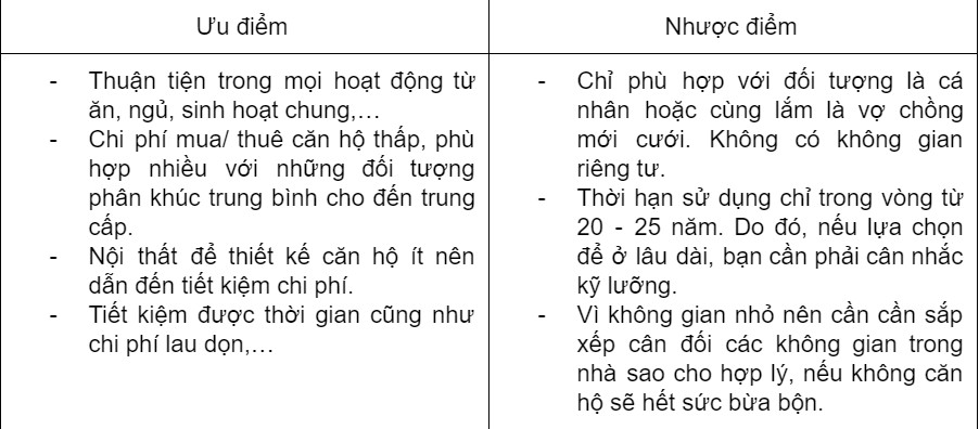 Cũng giống như bất kỳ mô hình nhà ở nào khác, các căn hộ studio đều có những ưu nhược điểm riêng biệt.