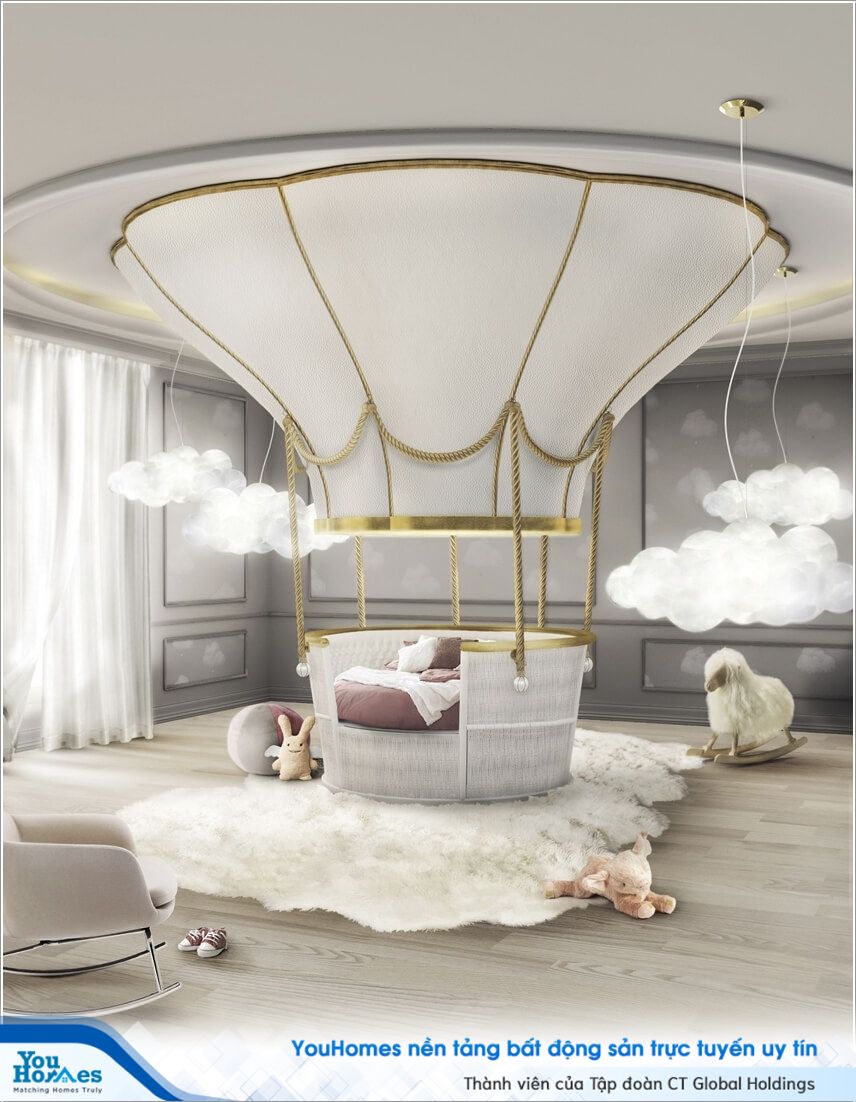 Một chiếc giường được kéo dài lên tận trần nhà mang hình dáng của chiếc khinh khí cầu tạo điểm nhấn trong phòng bé.