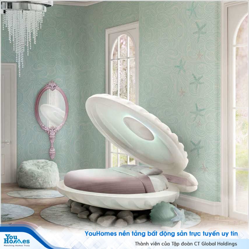 Chiếc giường vỏ sò dành cho tất cả các bé gái yêu thích nàng tiên cá. Nội thất khác trong phòng, bạn có thể trang trí theo chủ đề biển cả với màu xanh mát dịu, đồ chơi gối ôm hình cá heo, bạch tuộc, giấy dán tường với những con sao biển,...