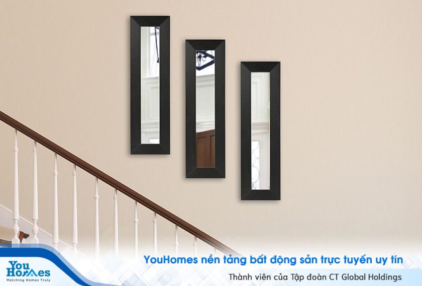 Thật ra mà nói, cầu thang là nơi lý tưởng để có thể treo gương. Bạn có thể đặt những chiếc gương nhỏ đan xen với các bức tranh dọc theo hướng cầu thang, hoặc ở bên hông cầu thang cũng là một ý tưởng không tồi. Theo phong thủy, cầu thang được coi là mạch dẫn khí đi lên các tầng trên của ngôi nhà. Khi cầu thang bắt buộc phải đặt ở những nơi chưa được vượng khí, việc sử dụng gương chính là giải pháp tối ưu giúp phản xạ lại những dòng năng lượng tốt.