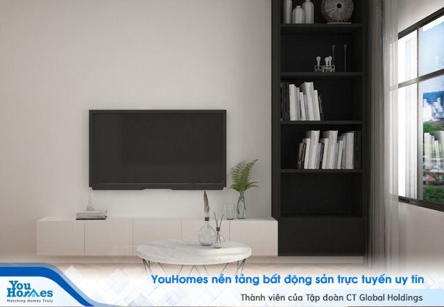 Phòng khách với kệ tủ cùng tông màu đen trắng tạo nên sự tương phản thú vị. Kệ tivi tiện dụng với nhiều ngăn và ô khác nhau giúp tiện lợi hơn trong việc cất và sắp xếp đồ đạc.