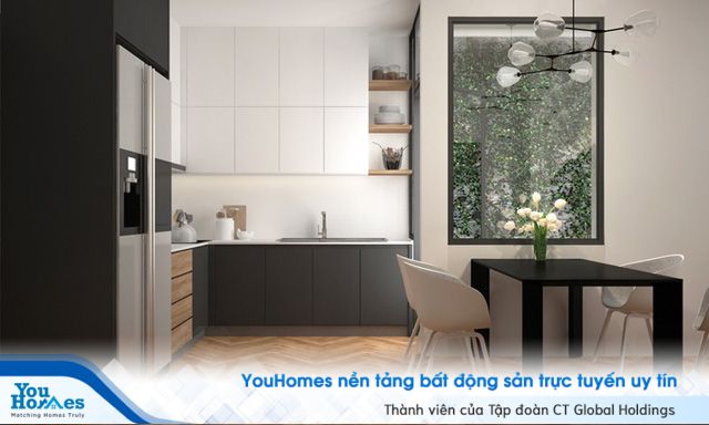 Phòng ăn với view cửa sổ nhìn ra vườn cây xanh giúp người sử dụng luôn có cảm giác thư giãn. Gian bếp với cách bài trí đơn giản cùng nhiều ngăn tủ giúp đồ đạc luôn được gọn gàng, sách sẽ.