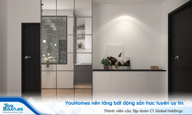 Không gian cửa ra vào với tủ đề giày và phần gương với thiết kế độc đáo giúp không gian căn hộ trở nên rộng rãi hơn nhờ đánh lừa thị giác.