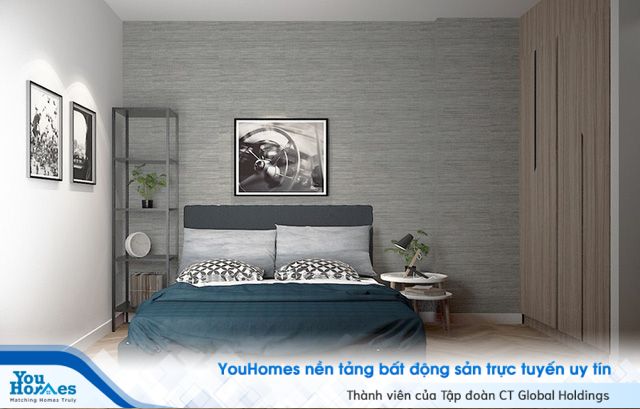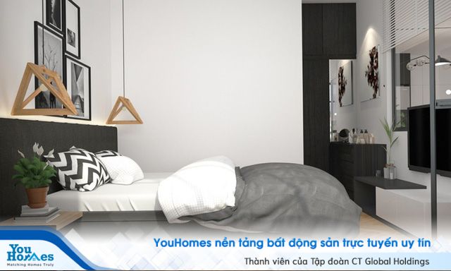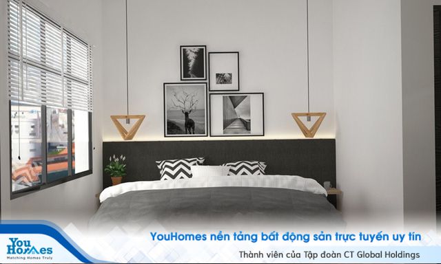 Phòng ngủ chính có diện tích rộng hơn được thiết kế kèm theo tử quần áo và kệ để đổ trang trí. Tranh ảnh với tông màu đen trắng phù hợp với tổng thể nội thất.