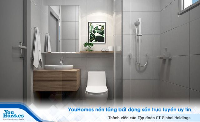 Phòng tắm nhỏ gọn những vẫn đầy đủ tiện ích. Thiết kế vách ngăn kính giúp cho nhà tắm luôn khô ráo, sạch sẽ.