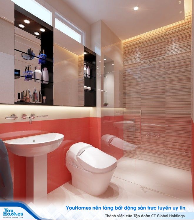 Phòng vệ sinh với gam màu lạ cũng thiết kế tối giản của các đồ nội thất bên trong đem đến cho người dùng sự tiện nghi, thoái mái nhất.