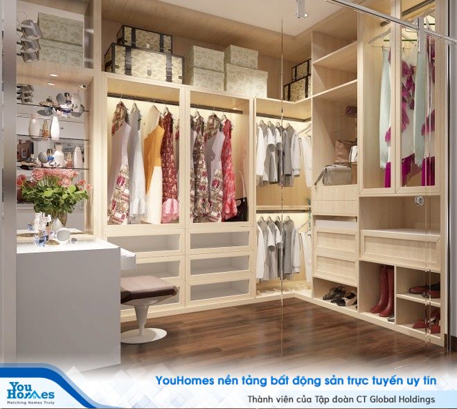 Phòng trang điểm và để quần áo cho cả gia đình được ốp gương cỡ lớn giúp căn phòng trở nên rộng hơn. Các ngăn tủ được thiết kế khá tiện lợi cùng nhiều ngăn chức năng giúp căn phòng trở nên gọn gàng và thông thoáng.