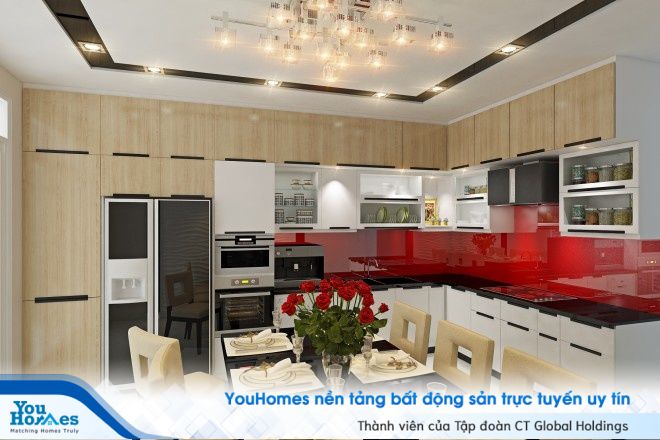 Không gian phòng bếp được ốp kính màu đỏ nổi bật, phần tủ chén bát được phủ kính giúp dễ dàng hơn trong việc tìm kiếm và sử dụng. Căn bếp khấ đầy đủ tiện nghi với phần lò nước, lò vi sóng và máy hút mùi, đem đến cho người sử dụng một sự thoải mái và tiện lợi nhất.