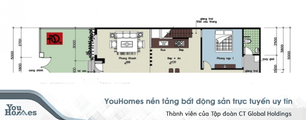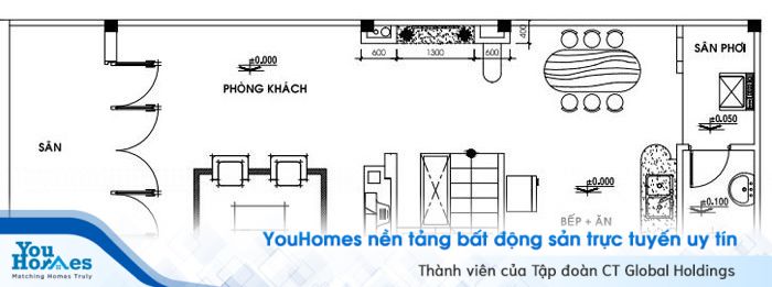 Mặt bằng tầng trệt của ngôi nhà được bố trí gồm: từ cửa chính đi vào là không gian phòng khách, tiếp đến là không gian phòng bếp và phòng ăn. Sân phơi và nhà vệ sinh được bố trí ở vị trí sau cùng.