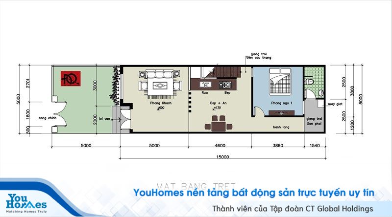 Bản vẽ mặt bằng tầng trệt mẫu nhà cấp 4 gác lửng mái thoái 5 x 15m