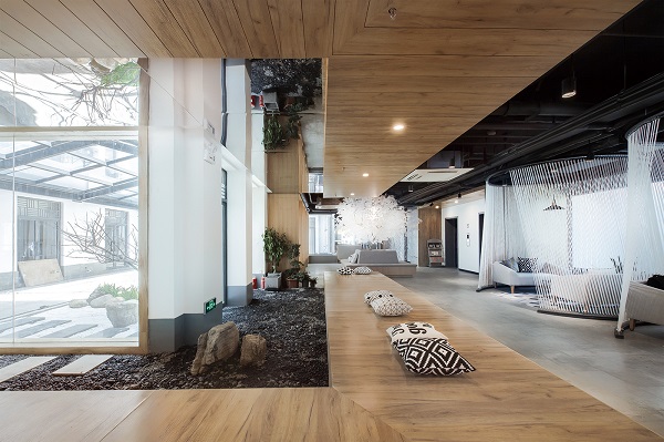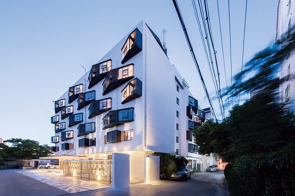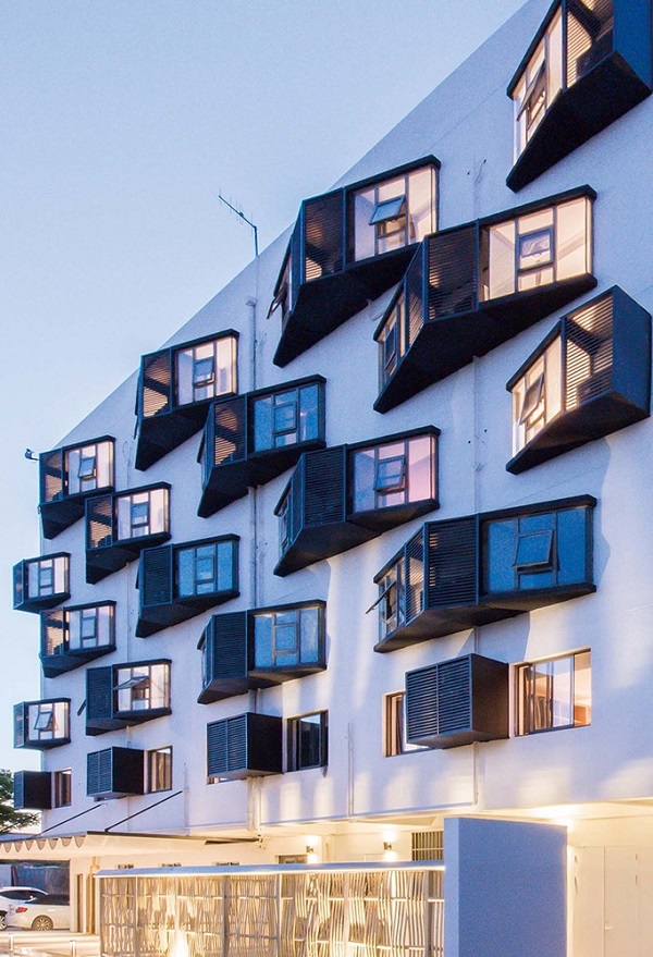 Điểm ấn tượng là mặt tiền xéo của tòa chung cư nổi bật với các khung cửa sổ gỗ màu đen, tích hợp với các ban công mini.