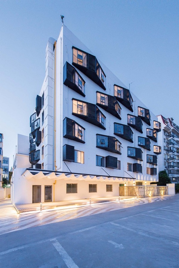 Các khối ban công mini - ô cửa sổ này được xếp sole theo hàng tạo nên những dải ban công độc đáo trên nền tường trắng.