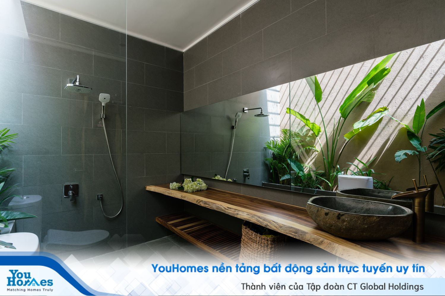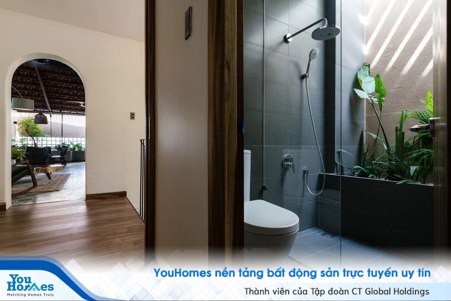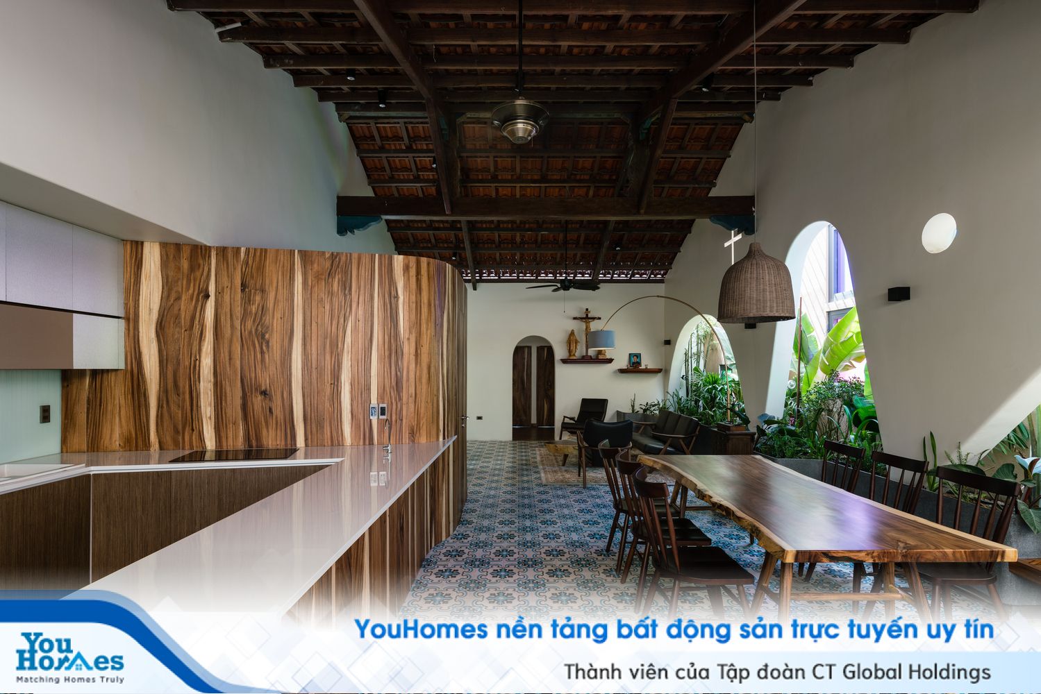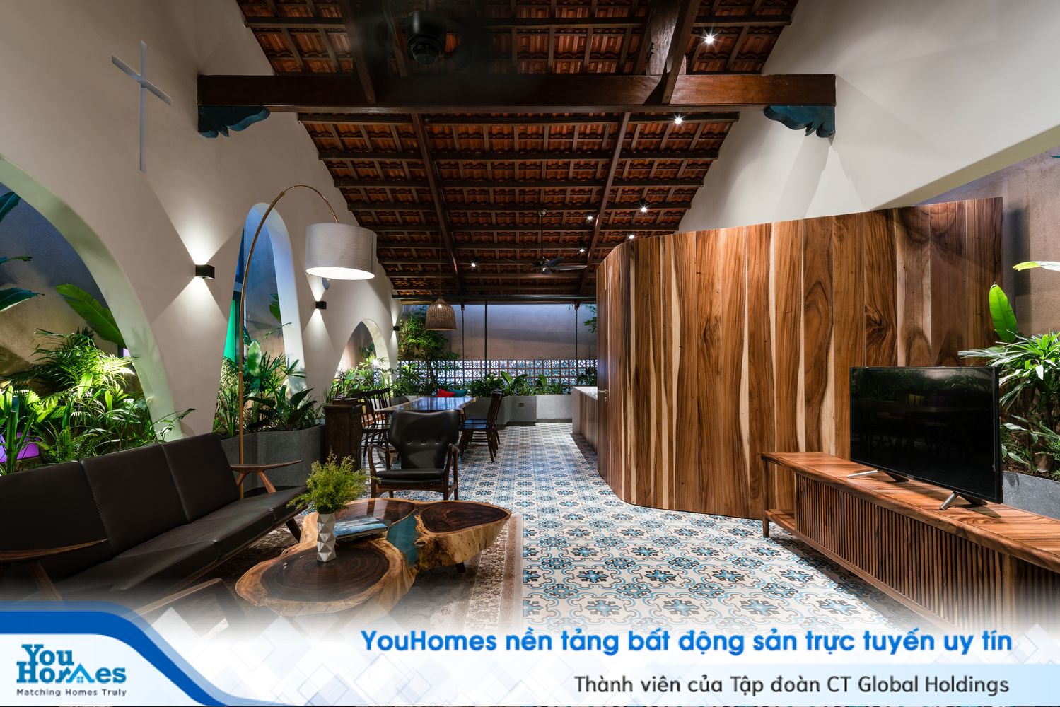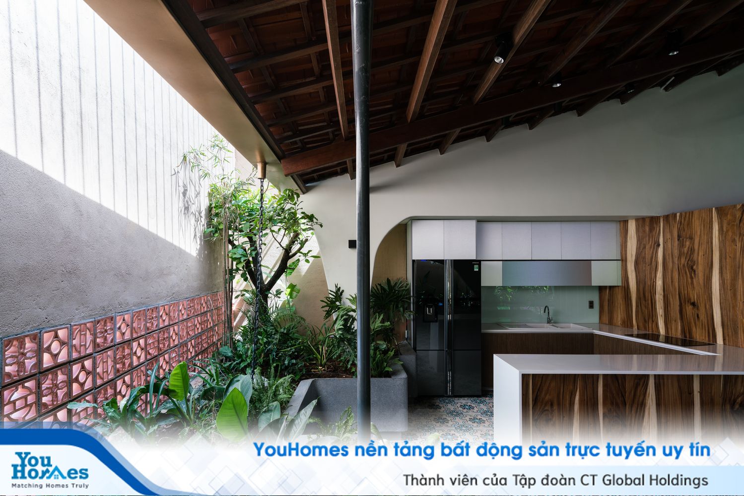 Ngay giữa phòng khách và bếp có một vách gỗ lớn ngăn cách phòng vệ sinh và phòng giặt để hạn chế tầm nhìn vào khu vực bếp. Mọi góc trong nhà đều điểm xuyến màu xanh tạo cảm giác thư giãn.