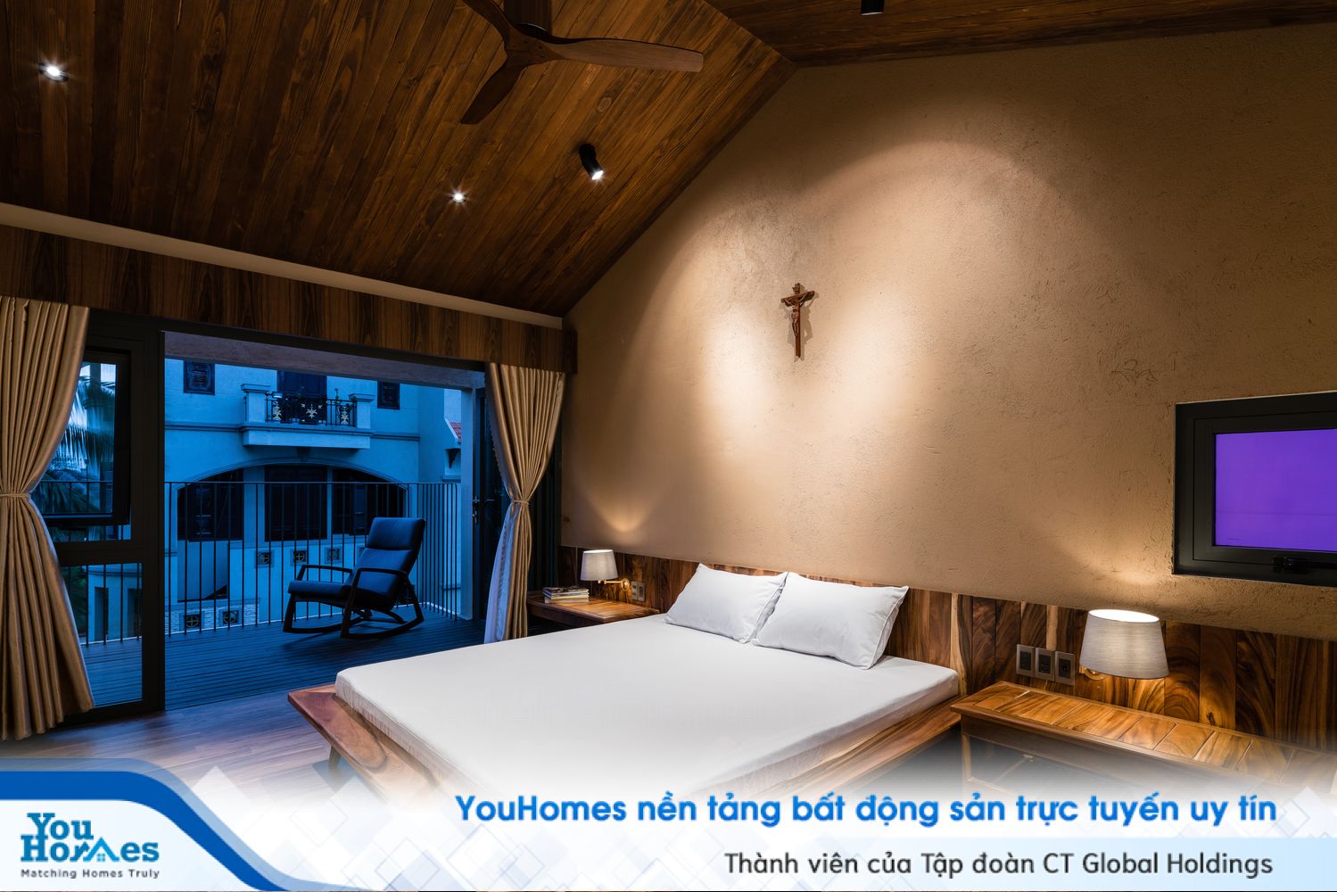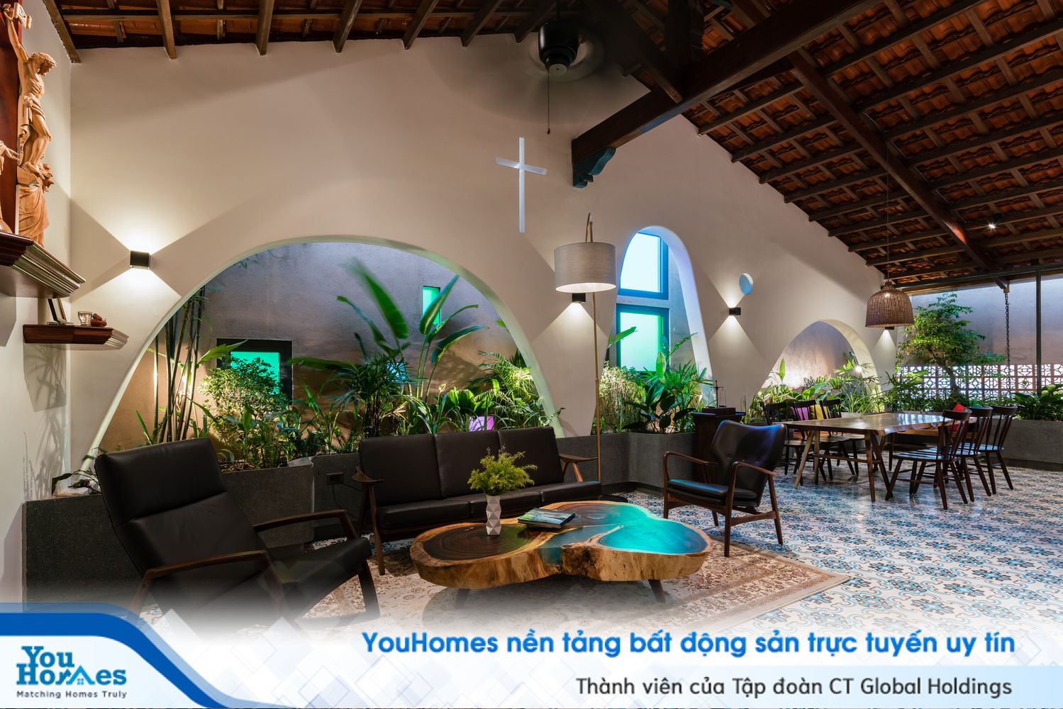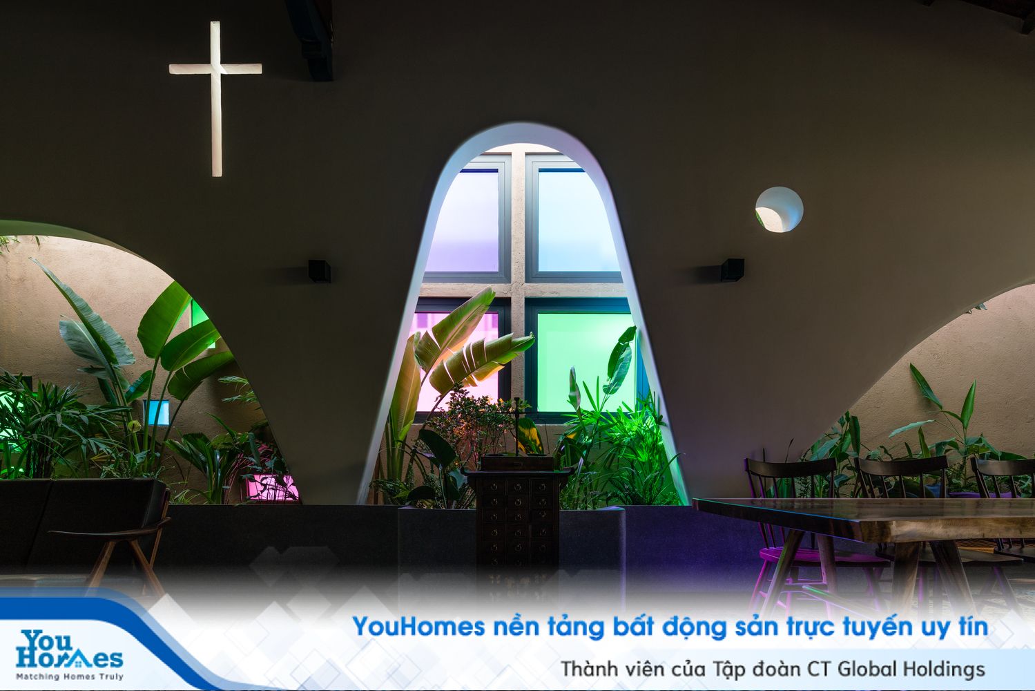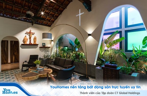 Bên cạnh đó, chủ nhà là người Công giáo vì vậy kiến trúc nghiên cứu kĩ để cố gắng thể hiện các chi tiết liên quan đến nhà thờ hoặc cây thánh giá. Trên mảng tường lớn, chúng tôi làm các ô cửa kính màu, khe ánh sáng hình cây thánh giá và các vòm cửa, tất cả khi kết hợp với ánh sáng mặt trời tạo ra hiệu ứng như một không gian tâm linh và huyền bí.