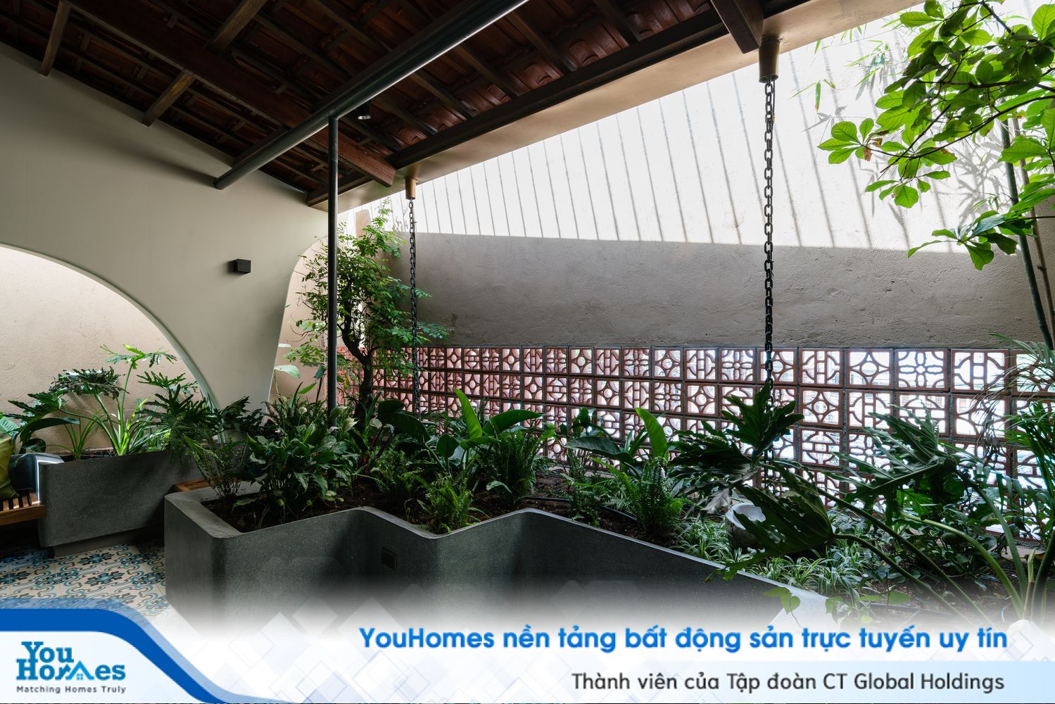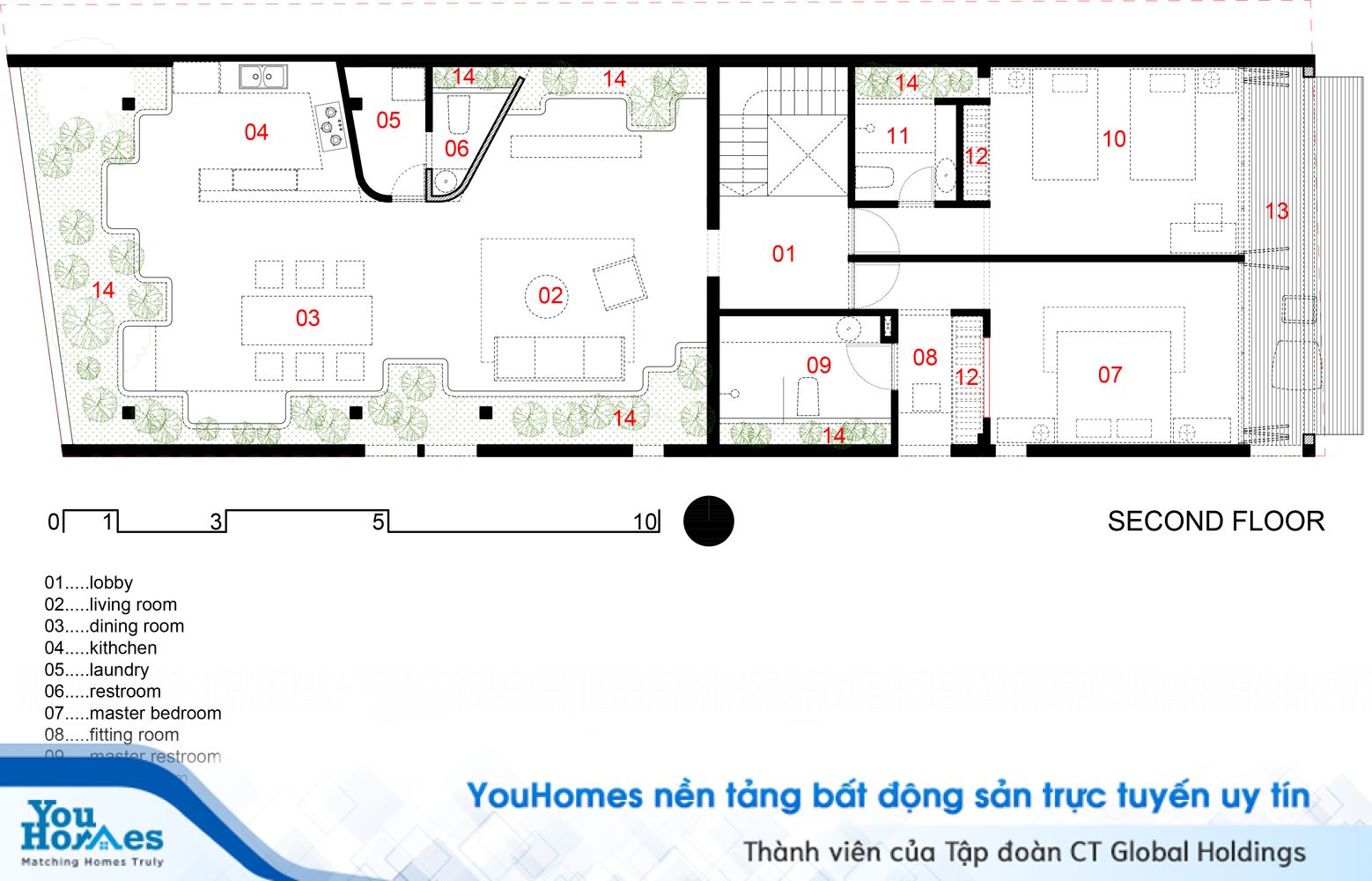 Trong khi đó tầng thứ 2 hội đủ công năng của một hộ gia đình, tại đây cũng được phân tách làm hai phần được ngăn chia bởi cầu thang và sảnh. Lý giải về giải pháp này là do ngôi nhà tiếp xúc với đường lớn thường xuyên có nhiều hoạt động ồn ào và bụi bặm, để khắc phục nhược điểm này kiến trúc sư đã sử dụng gạch bông gió để tạo khu vườn và khoảng trống để lấy ánh sáng mặt trời bên trong.