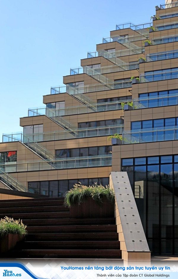 Khối nhà phân tầng chủ yếu làm từ bê tông, cốt thép, ô kính màu. Hệ thống mặt tiền có phần cầu thang rộng rãi, mang thiết kế hiện đại.