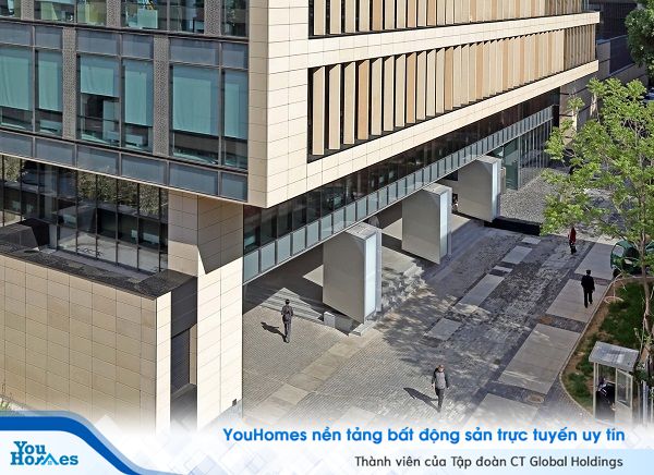 Còn đây là lối ra vào của tòa nhà hình dẹt chữ nhật phức hợp. Phần kiến trúc này mang lối thiết kế đơn giản hơn.