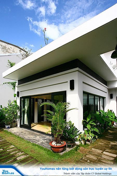 Trái ngược với lối kiến trúc thông thường, thiết kế nhà phố 2 tầng này sẽ mang đến cảm giác thoáng đãng với hệ thống cây xanh tươi mới. Ngoài không gian lưu thông trong nhà, bên ngoài có một lối độc lập vào bếp. Kế bên là cầu thang giản dị dẫn lên mái phòng khách.