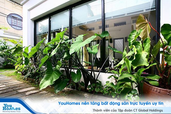 Việc bố trí sân vườn xung quanh nhà đã mang đến không gian một điểm nhấn xanh mướt hương vị thiên nhiên mang lại cảm giác yên bình cho gia chủ.