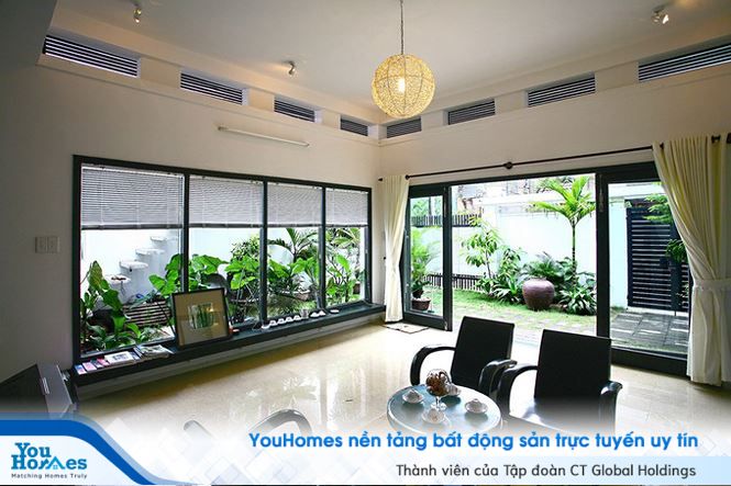 Nhà có hai tầng với kiến trúc hiện đại, khiêm nhường mà không phô trương. Phòng khách được thiết kế với những cánh cửa rộng tạo cảm giác thoãng đãng hơn như những lời chào đón khách đến chơi nhà. Từ phòng khách nhìn qua các của kính sẽ thấy được khung cảnh tươi mát bên ngoài sân.
