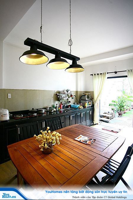 Phòng bếp được thiết kế rất tiện nghi và sử dụng màu sắc trầm ấm. Phòng bếp được kết nối với phòng khách và khoảng sân vườn phía trước. Ngồi trong bếp có thể ngắm được cảnh khu vườn xanh tươi mát mẻ.
