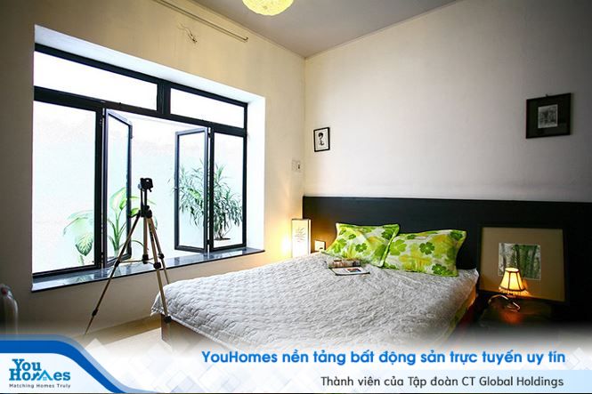 Phòng ngủ có nội thất giản dị và luôn ngập tràn ánh sáng nhờ cửa kính lớn được chiếu sáng từ giếng trời phía sau.