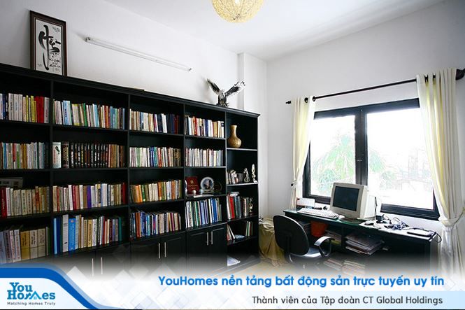 Góc làm việc nhỏ trong thư phòng hướng ra khoảng sân trước đón được ánh sáng tự nhiên từ bên ngoài chiếu vào. Vừa làm việc vừa nhìn được cảnh vật yên bình bên ngoài.