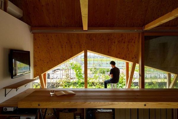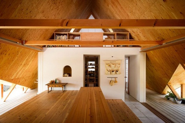 Ngôi nhà được xây dựng như một chiếc lều gỗ lớn, tích hợp nhiều không gian lưu trữ, có vách ngăn và nhiều phòng riêng biệt. Không gian bên trong chủ yếu nổi bật bởi các bề mặt bằng gỗ, trong khi ánh sáng tự nhiên bên ngoài chiếu vào nhà thông qua các lỗ hình tam giác trên cấu trúc.