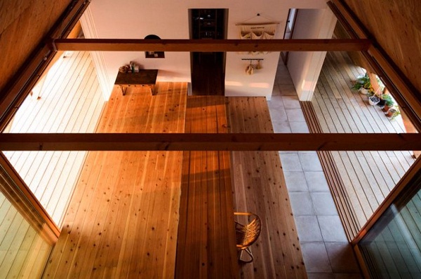 Phần mái hiên bằng gỗ này được thiết kế dạng mở, vừa đóng vai trò là lối ra vào chính, mang ánh sáng bên ngoài chiếu trực tiếp vào bên trong.