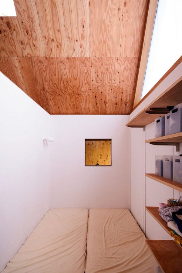 Phòng ngủ cực kỳ tối giản, có kệ và nệm trên sàn nhà.