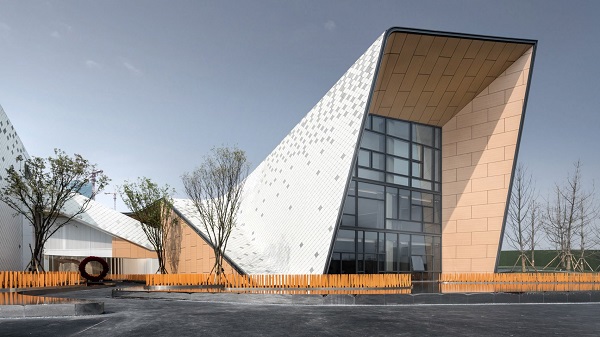 Thiết kế độc đáo của trường mẫu giáo với các tấm lợp kim loại bao phủ hình dạng gấp khúc của Trường mẫu giáo Park Legend ở Thành Đô, Trung Quốc, mô phỏng các đỉnh núi gần đó.