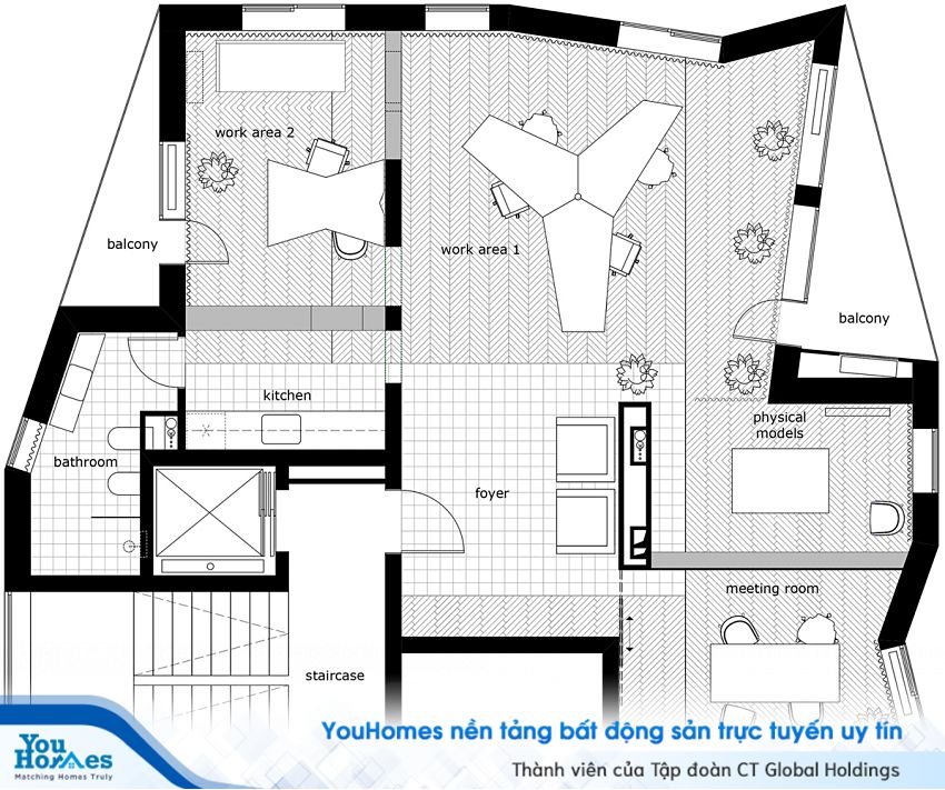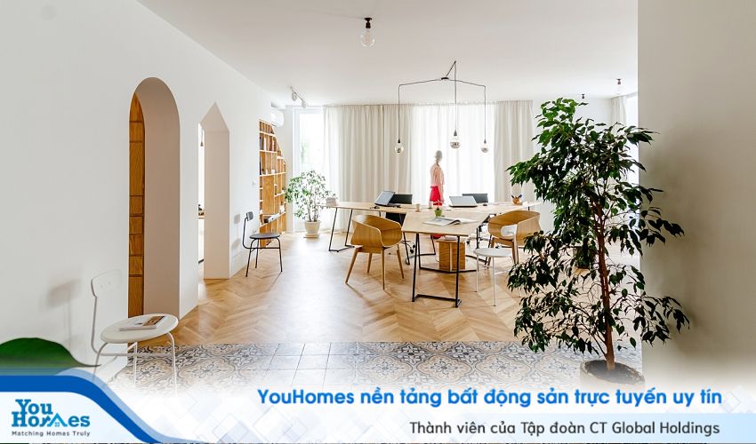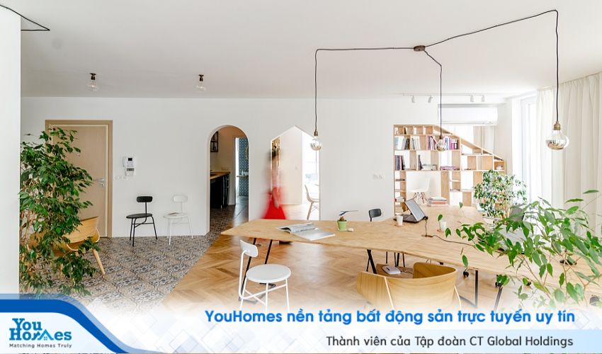 Một phần sàn nhà được trang trí bằng gạch cổ điển có hoa văn retro để phân chia khu vực, mang lại không khí làm việc thoải mái.