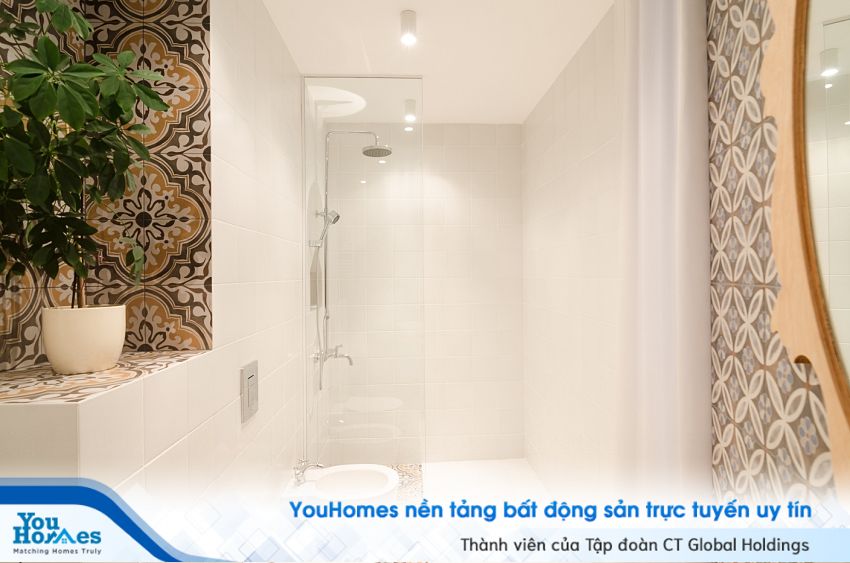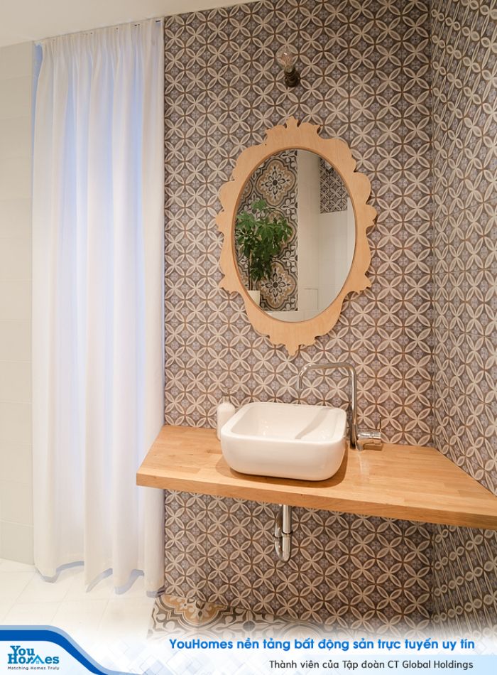 Phía trong là một nhà vệ sinh cũng được trang trí với gạch cổ điển độc đáo cùng gương lớn.