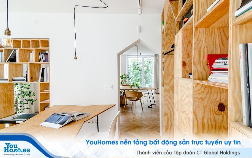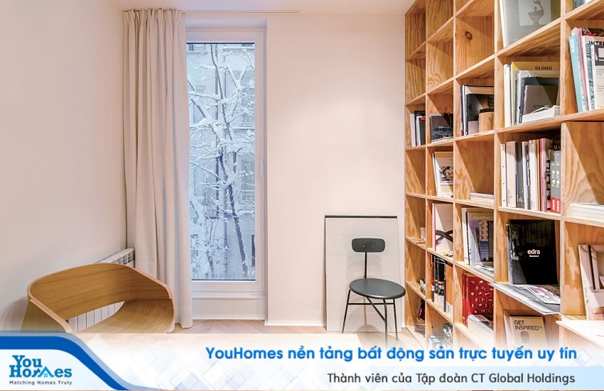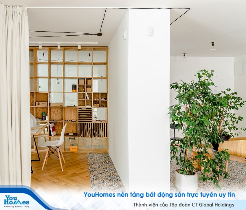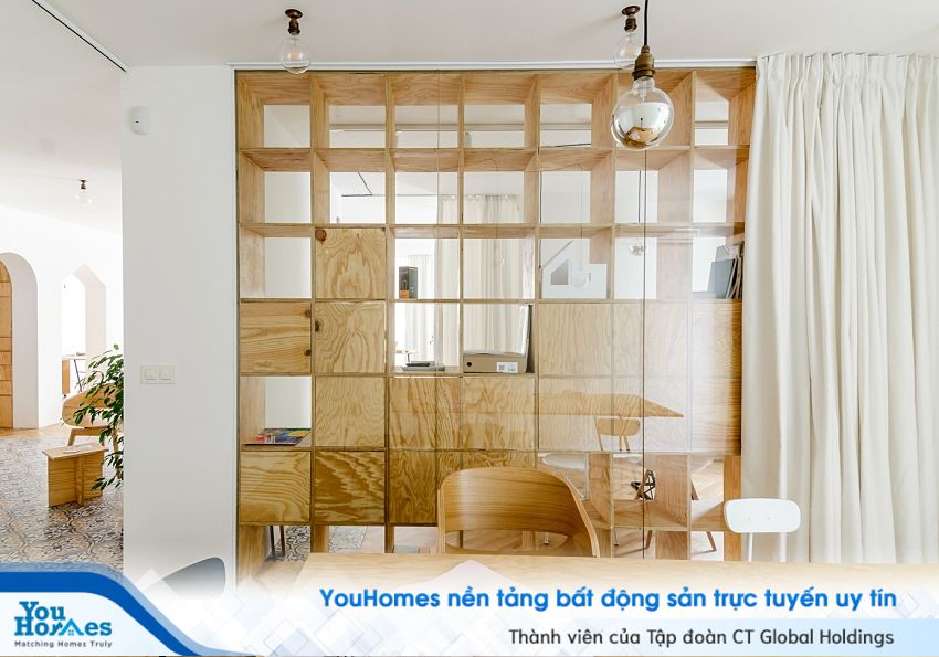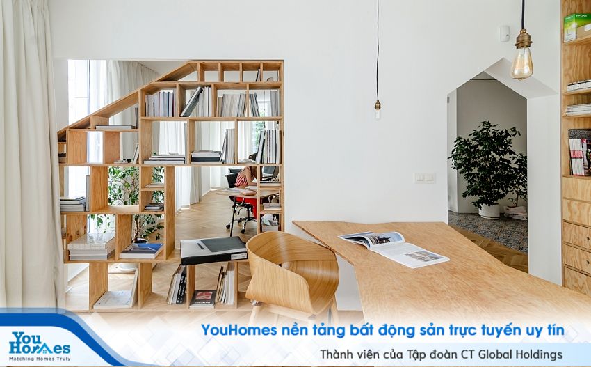 Những vách ngăn bằng gỗ tạo thành một thư viện mở, đồng thời tách các khu vực trong khi vẫn duy trì kết nối trực quan giữa các không gian.