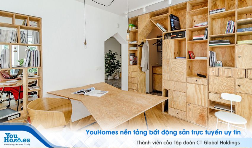 Vách ngăn các không gian khác nhau bằng tủ gỗ dán, chia 2 khu vực làm việc, phòng họp, bếp nhỏ, nhà vệ sinh và sân thượng.